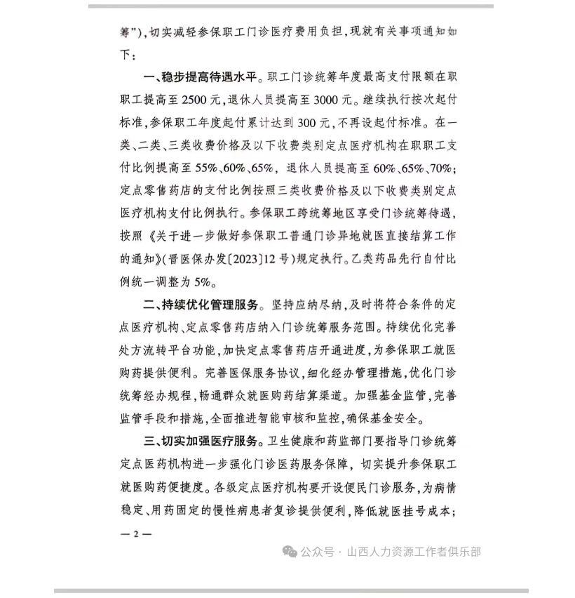 2024年7月1日起施行,完善職工基本醫(yī)療保險(xiǎn)普通門診統(tǒng)籌政策:在職職工提高至2500元,退休人員提高至3000元。