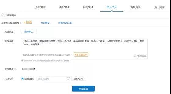 結(jié)合短信通知功能,我們提前編輯好祝福信息或通知,系統(tǒng)到期自動發(fā)放,且短信是包 含企業(yè)簽名的。而提前收到通知的人事也有充足的時間給員工準(zhǔn)備相關(guān)活動或禮物,大幅度 增強(qiáng)歸屬感。